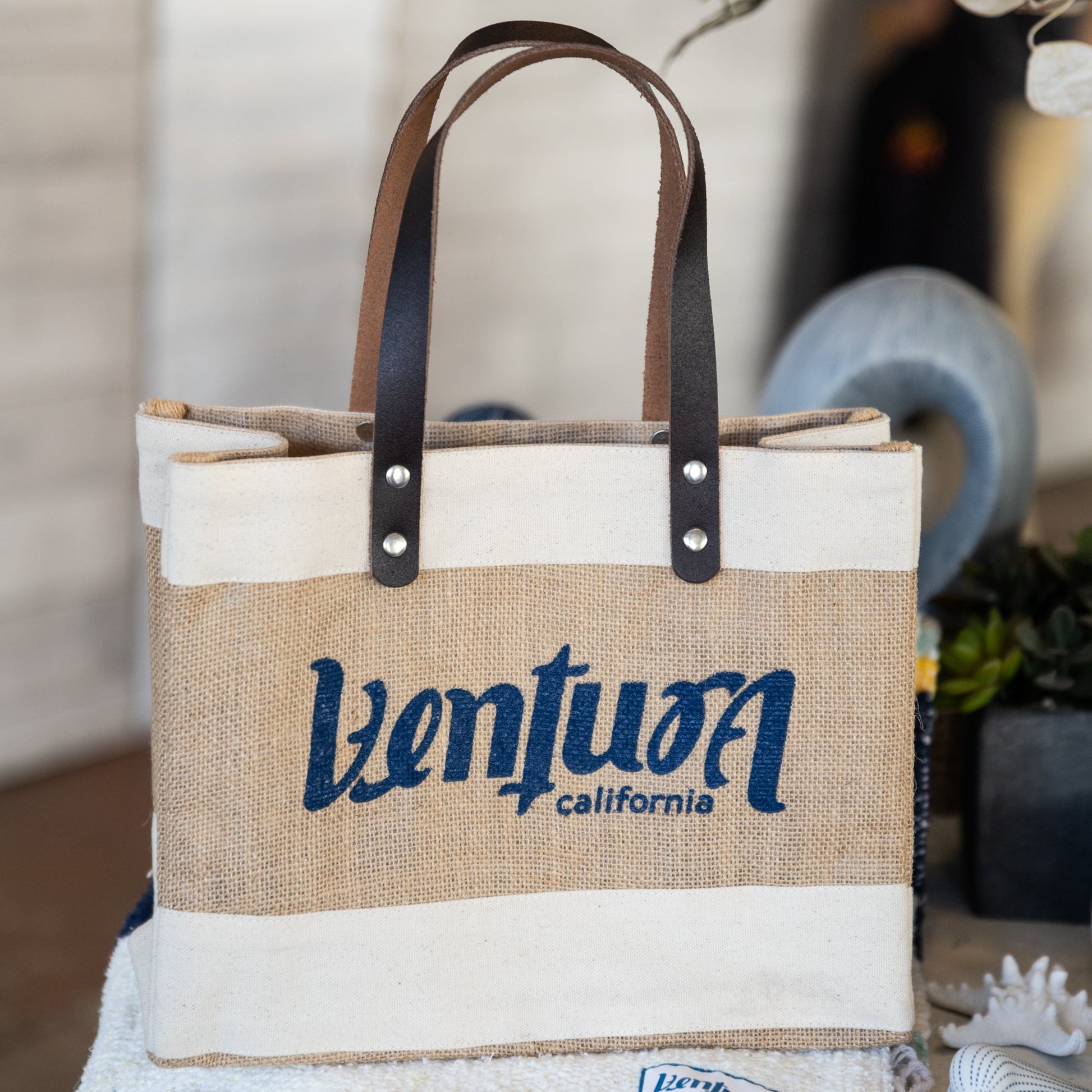 Our petit luxe tote is the perfect size for a quick afternoon run to the beach or office lunch essentials. Jute and cavas with leather straps.
