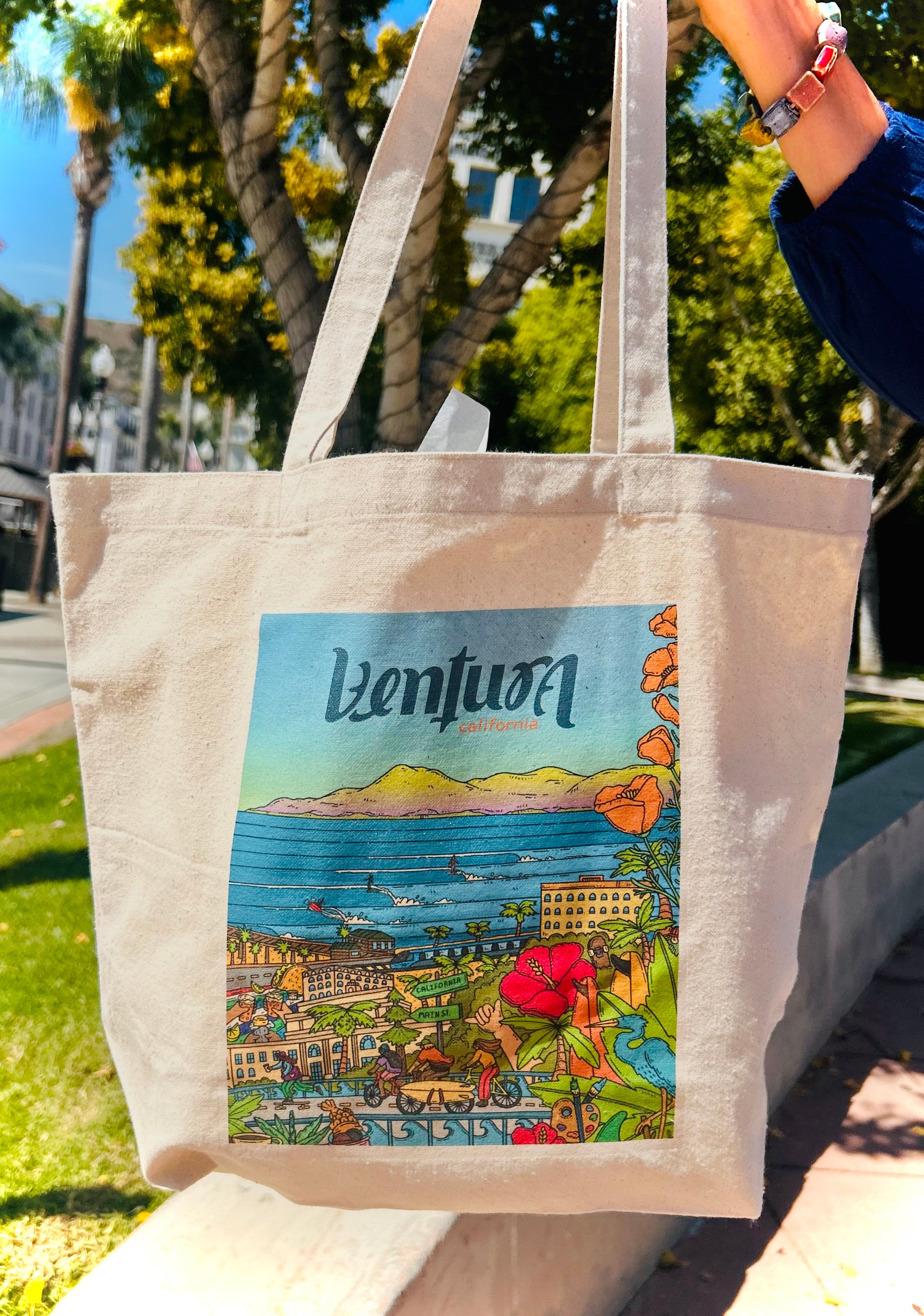 Made of tough stuff -- and emblazoned with an imaginative drawing of all we love about Ventura -- our Ventura tote bags will last through more errands and grocery shopping than you’d ever want to do. You can also put a whole lot in them.