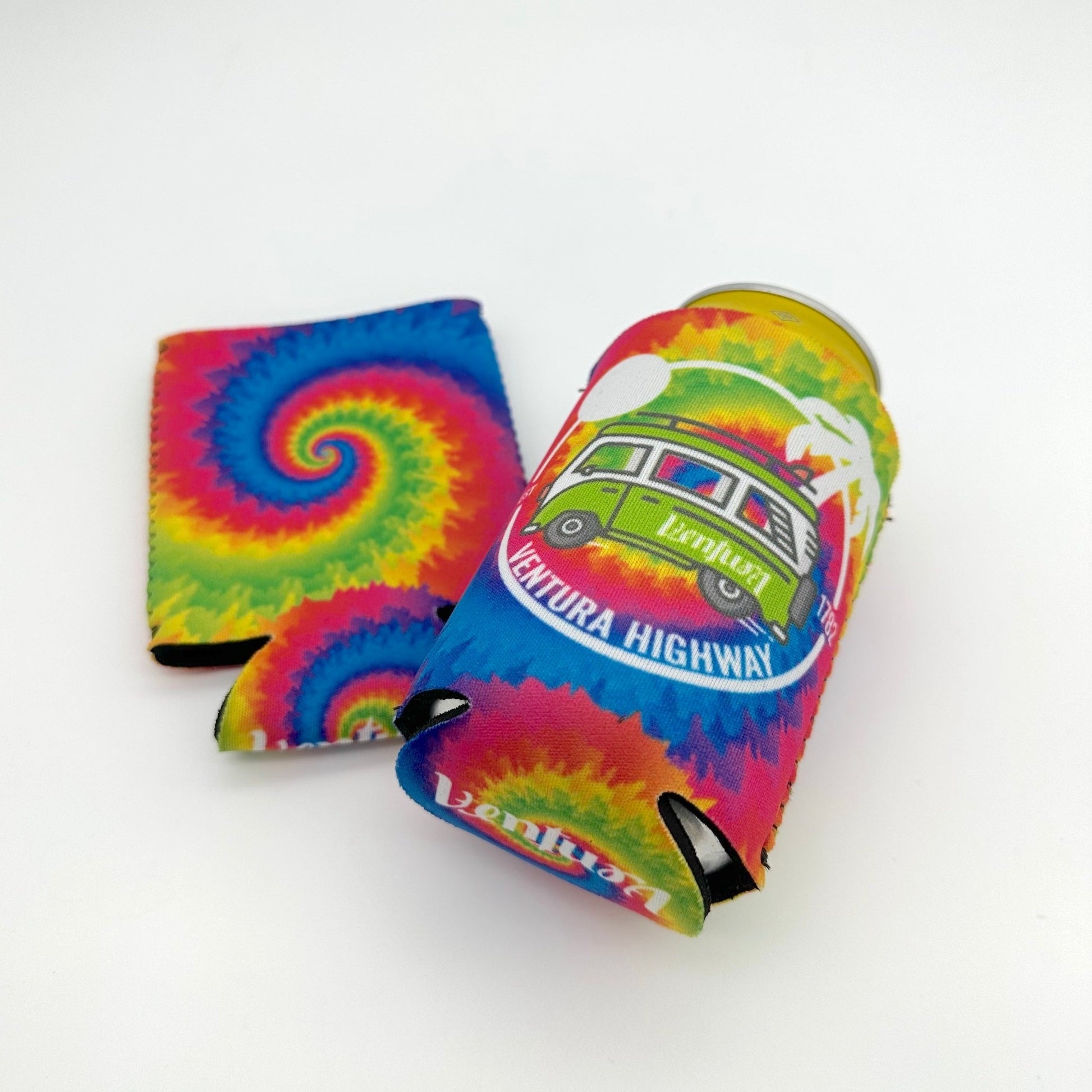Tie dye koozies feature VW van on the front, Ventura ambigram logo on the bottom and colorful swirl on the back.